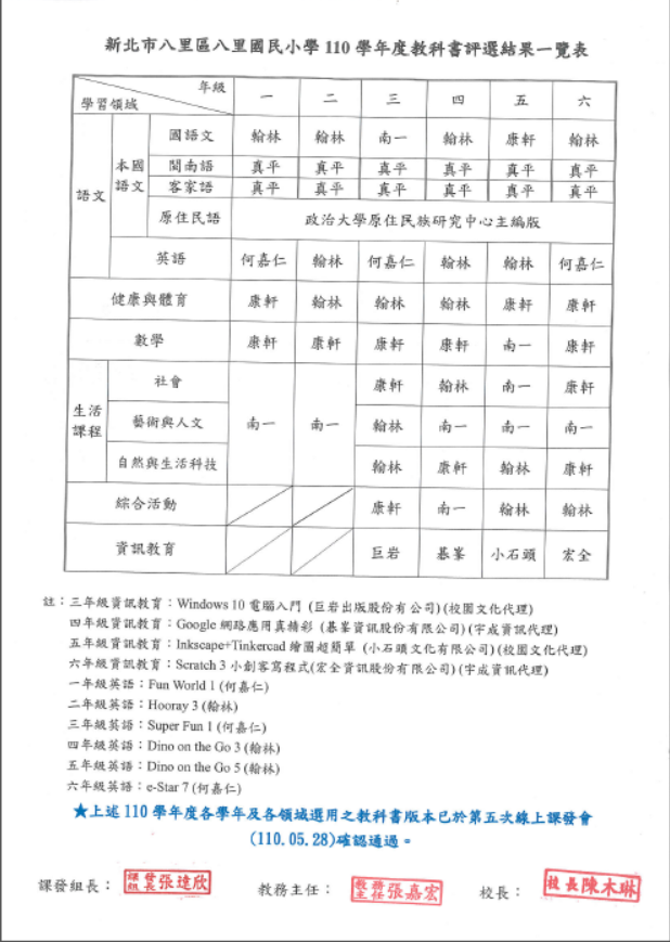 公告本校110學年度教科書版本選用一覽表,如附加檔案,同時公布於學校首頁 / 校園公告區, 請老師及家長參考。 課發組 敬上26102217分機6104 請見附加檔案。