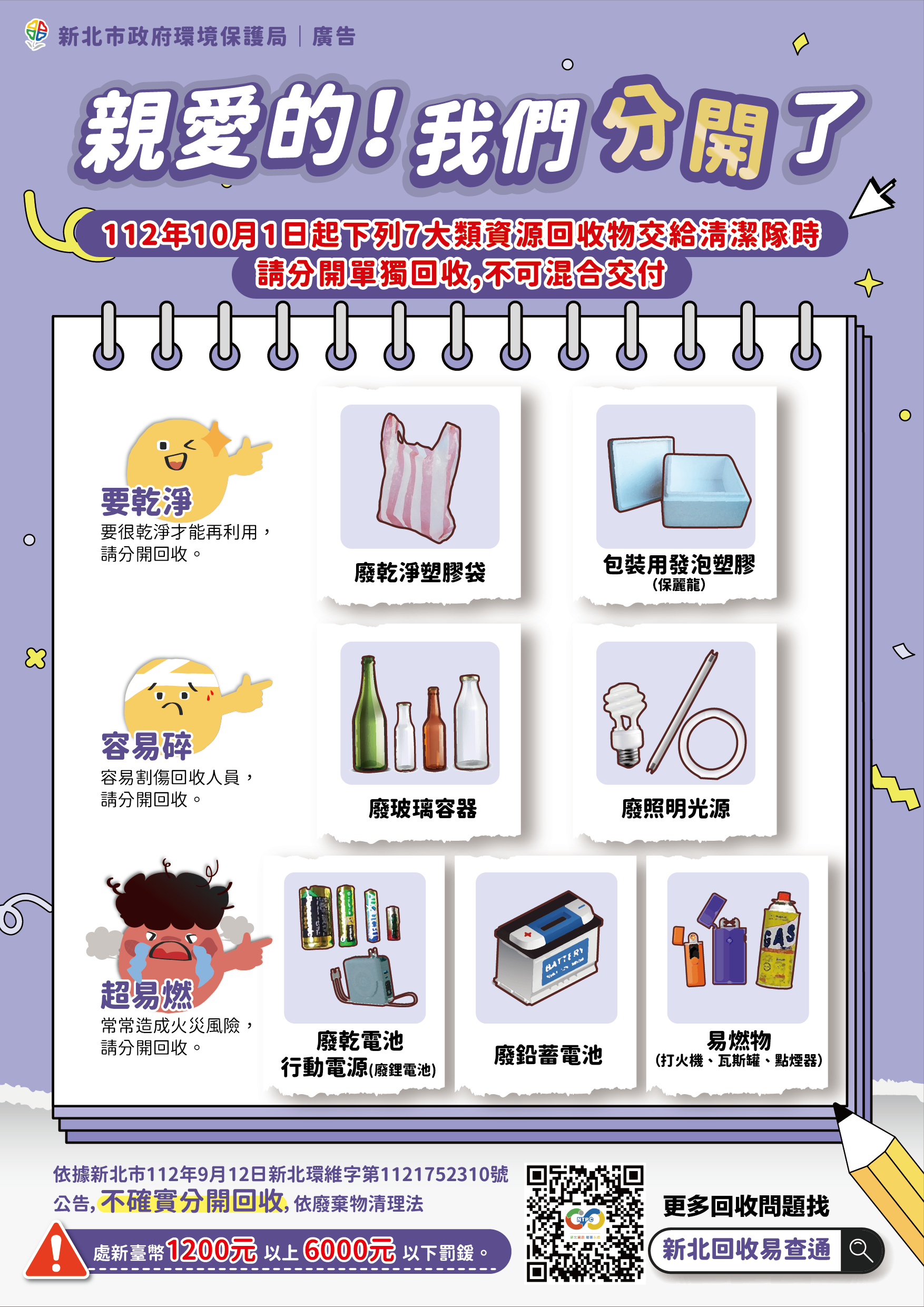 二、旨揭公告自112年10月1日起生效,公告內容涉及家戶產生之一般廢棄物應回收項目其分類及排出方式,新增公告排出之廢乾淨塑膠袋、廢玻璃容器、包裝用發泡塑膠(保麗龍)、廢照明光源、廢乾電池與廢鉛蓄電池、易燃物(卡式瓦斯罐、打火機、點煙器等)應分開單獨交付回收,且盛裝資源回收物之袋子或箱子,應使用可由外觀辨明內容物之透明或半透明材質,始能交付回收。