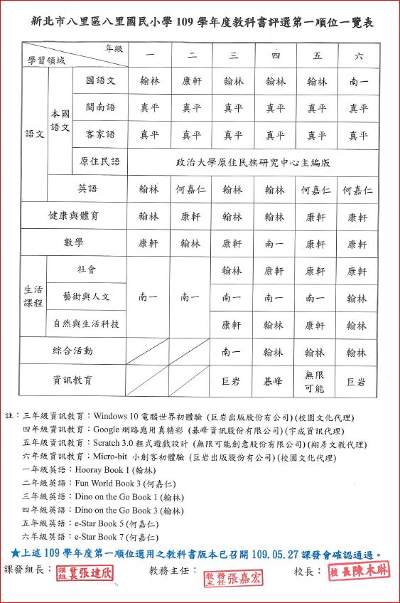 109學年度教科書選用版本一覽表